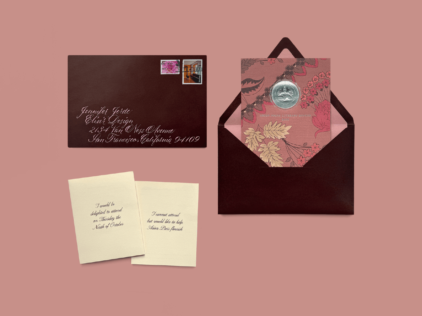 Each year, Arion Press gathers Bay Area authors, artists, and supporters for its annual Literary Dinner. The 2025 event, inspired by "Mrs. Dalloway," called for graceful and atmospheric event collateral.