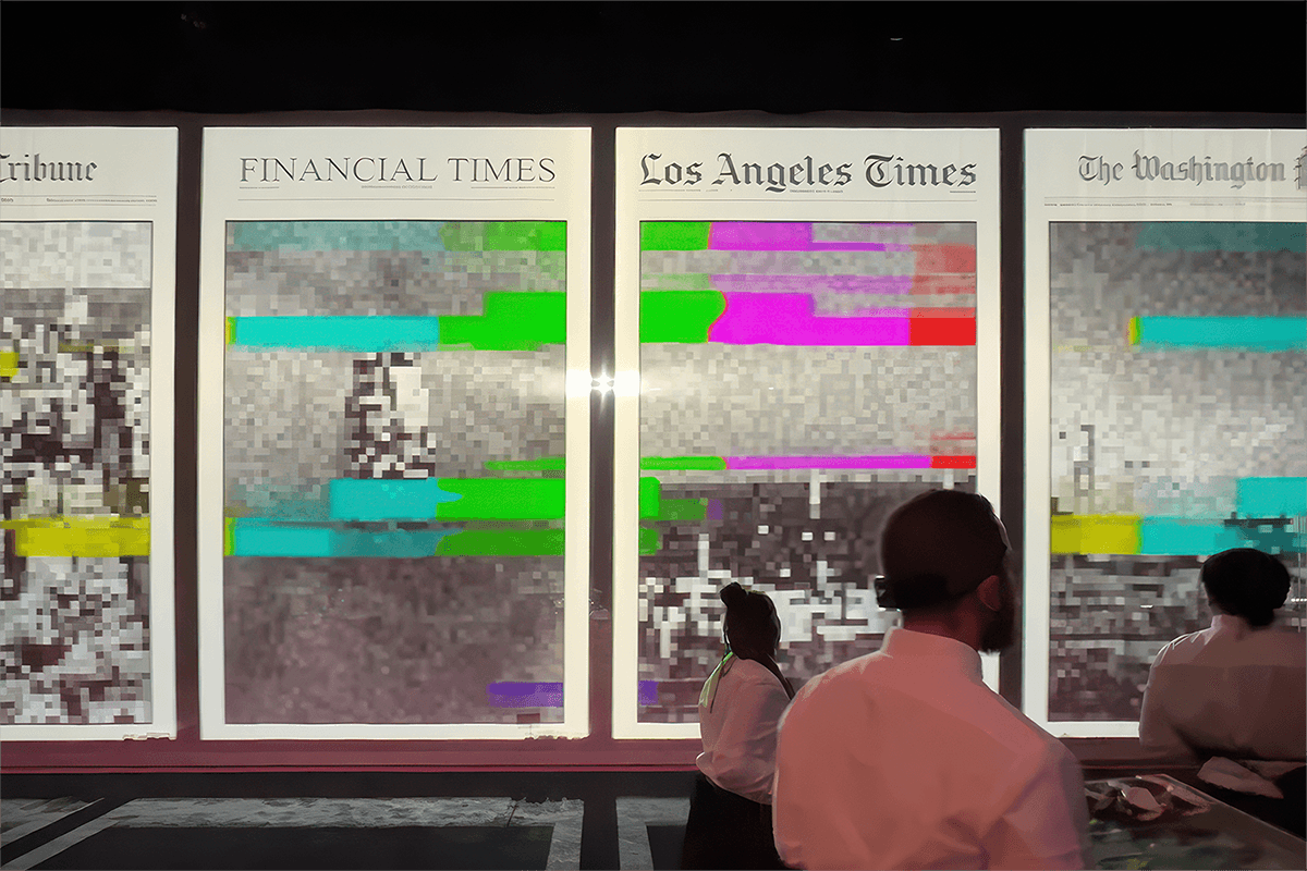 As cocktail hour drew to a close and the dinner program was about to begin, the once black-and-white images of San Francisco began to glitch, gradually revealing a vibrant spectrum of colors.